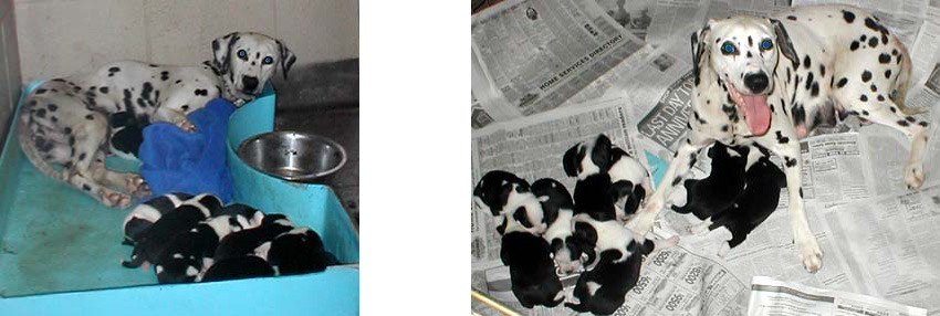 Gorgeous Dalmatian mama with 8 newborn puppies. Must be adopted as an intact family. Call shelter for details.